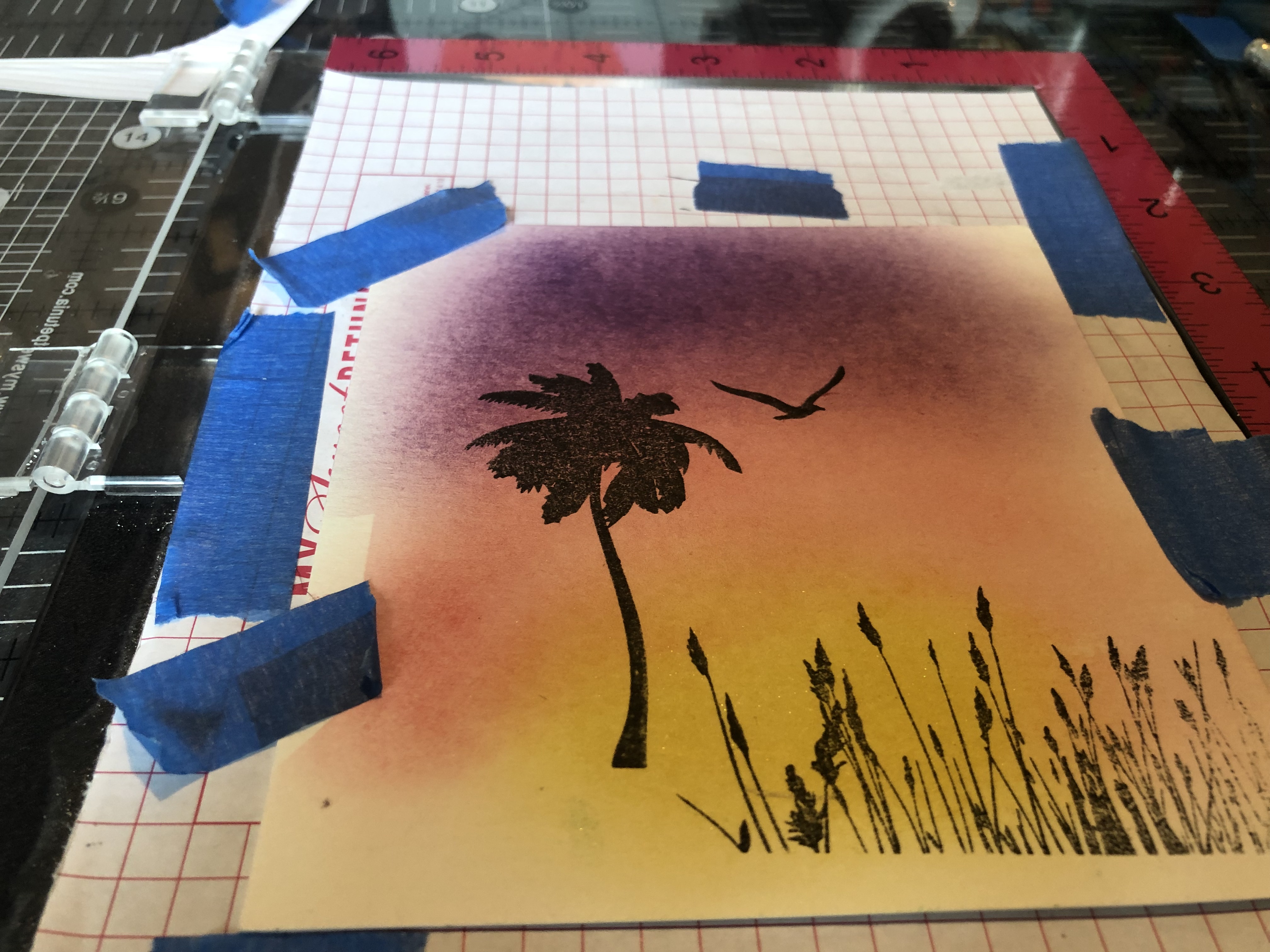 Next I used my misti stamp tool to stamp a image from Gradient Sunset stamp set. I stamped the image three time to get as dark as I liked.
