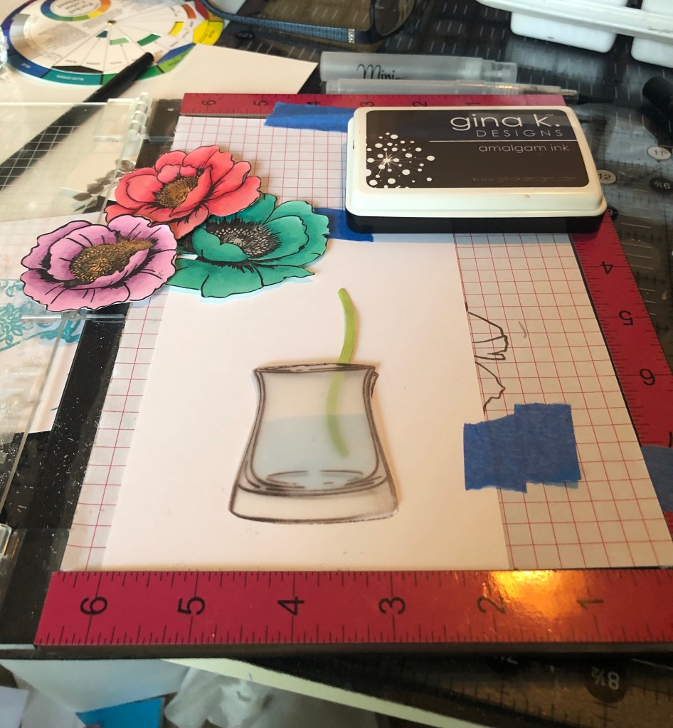 I used my Misti stamp positioning tool and stamped the wall paper stamp. I colored in the image with markers and then I cut them out. Then. I stamped the vase on card stock and on vellum. I cut out the vellum and colored a water line. Next I cut out stems for the flowers and assembled the card. I added a sentiment and in the top picture you can see the finished card. I love the bright cheery feel of this card.