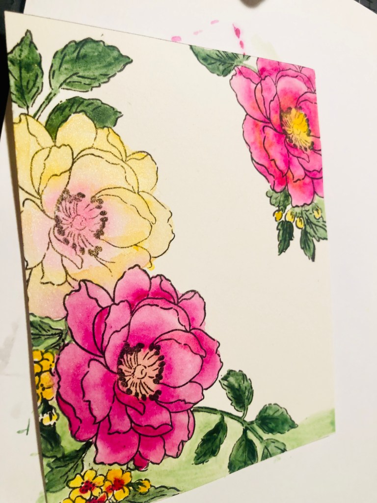 To make my card, I started with Arches watercolor paper cut to 4 1/4 to 5 1/2. I stamped with beautiful day stamp set and masked two of the flowers.