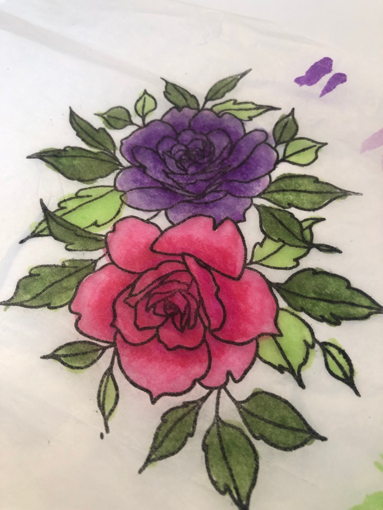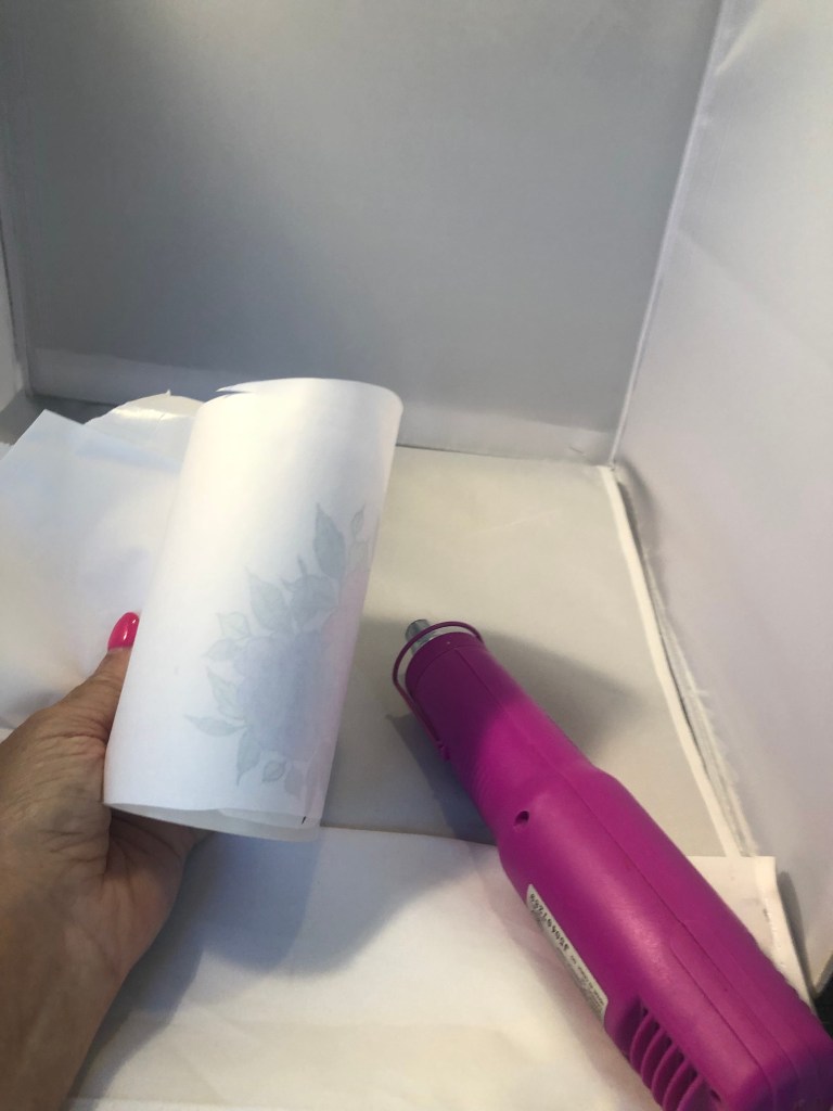 Start by stamping on white tissue paper, and color in with copic markers. When coloring make sure that you have a piece if card stock underneath the tissue paper or it will bleed thru. Next, cut a piece of freezer paper to hold candle and place the image where you would like it to be on candle and then wrap with the paper. Use your heat gun and melt in to candle. Be careful to take it slow and check your progress!
