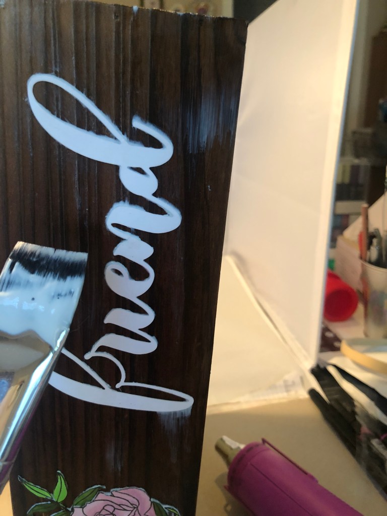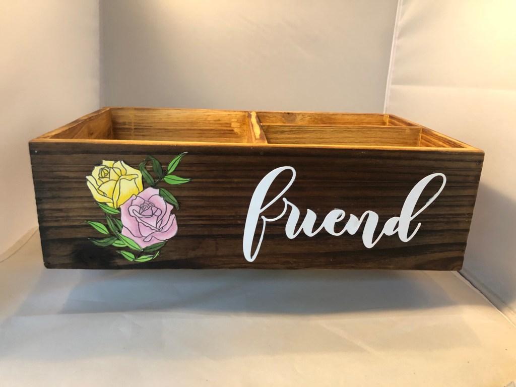 I took a box that I used for that napkins and forks and knives go in and made it the container for my project. In this project I used Altenew’s Forever in Love Stamp set. I stamped on white card stock and colored in with copic markers. I cut out Friend Mega die out of white card stock. I glued the Images on the box then I used Deco Art Gloss and decoupage the side of box.