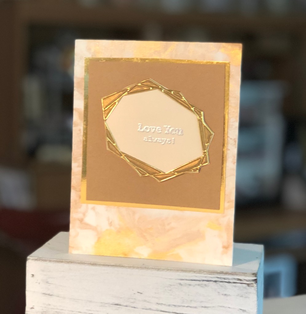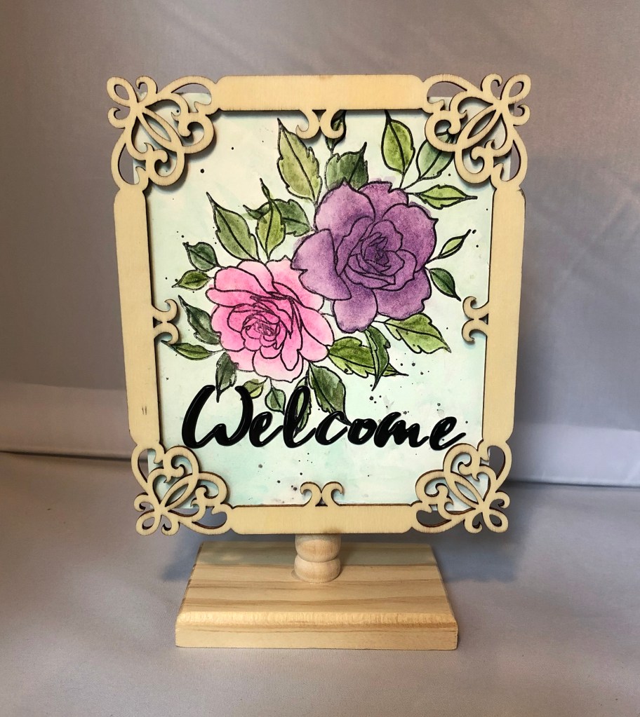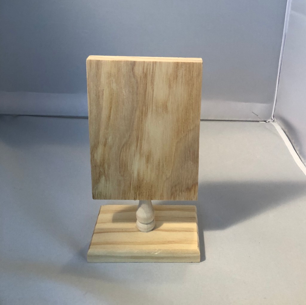 I found this cute little pedestal and frame at the local craft shop. I bought stain to finish it . While I was putting my project together I decided I loved the raw wood look. I put velcro on the frame and pedestal to hold the card into place. I made the card using the forever in love stamp set, I then watercolored it. The lettering is from Altenew’s live your dream scrap book collection.