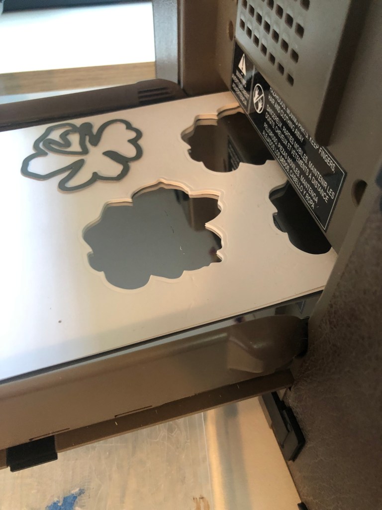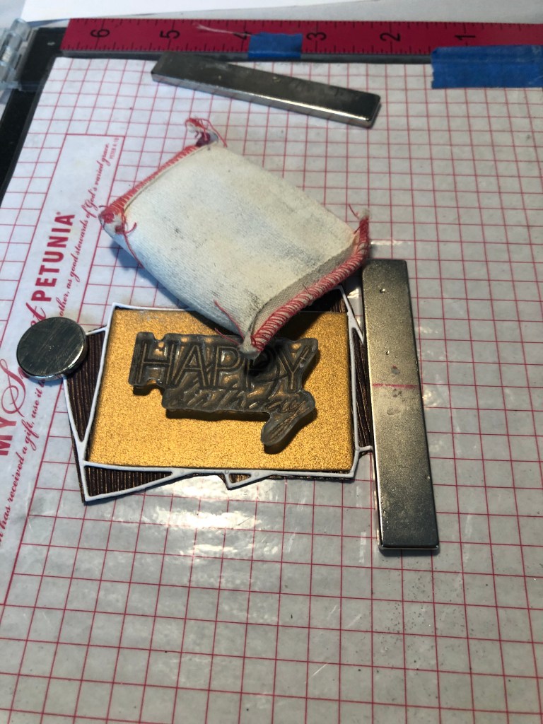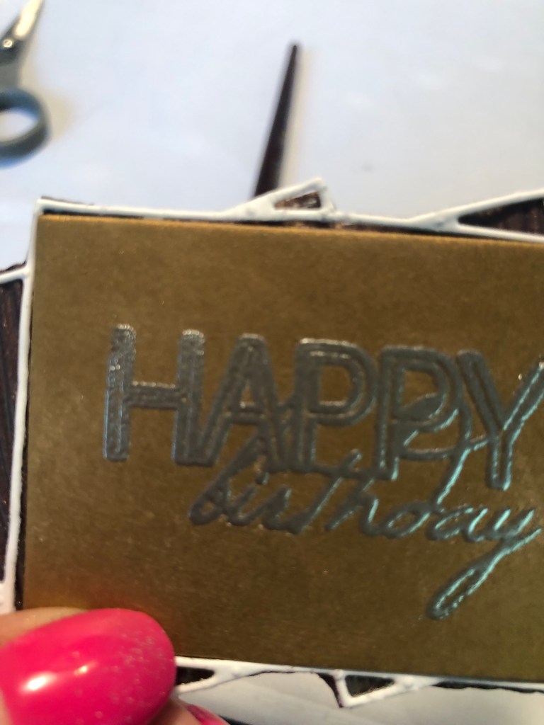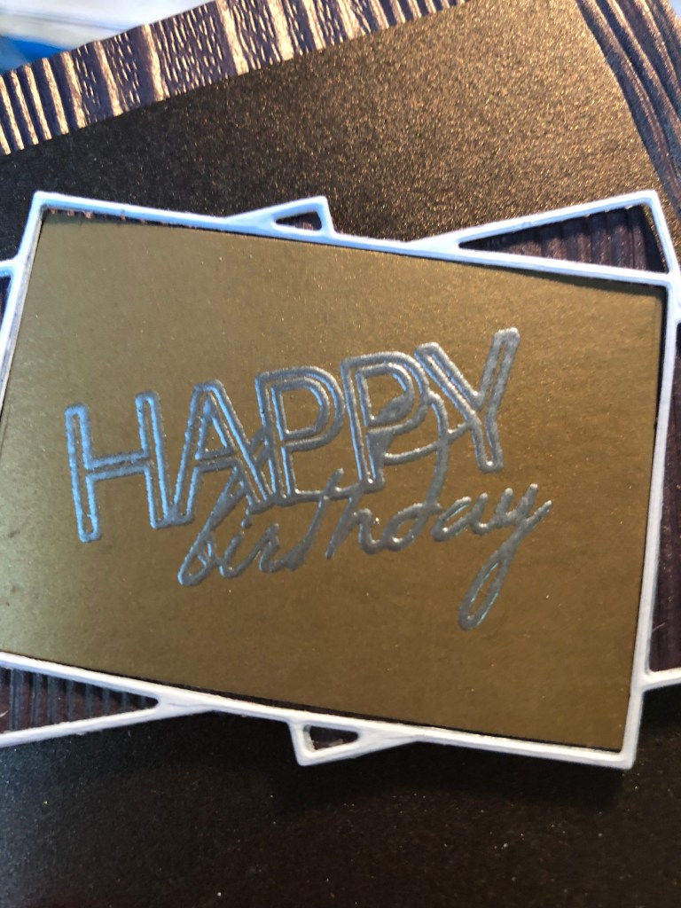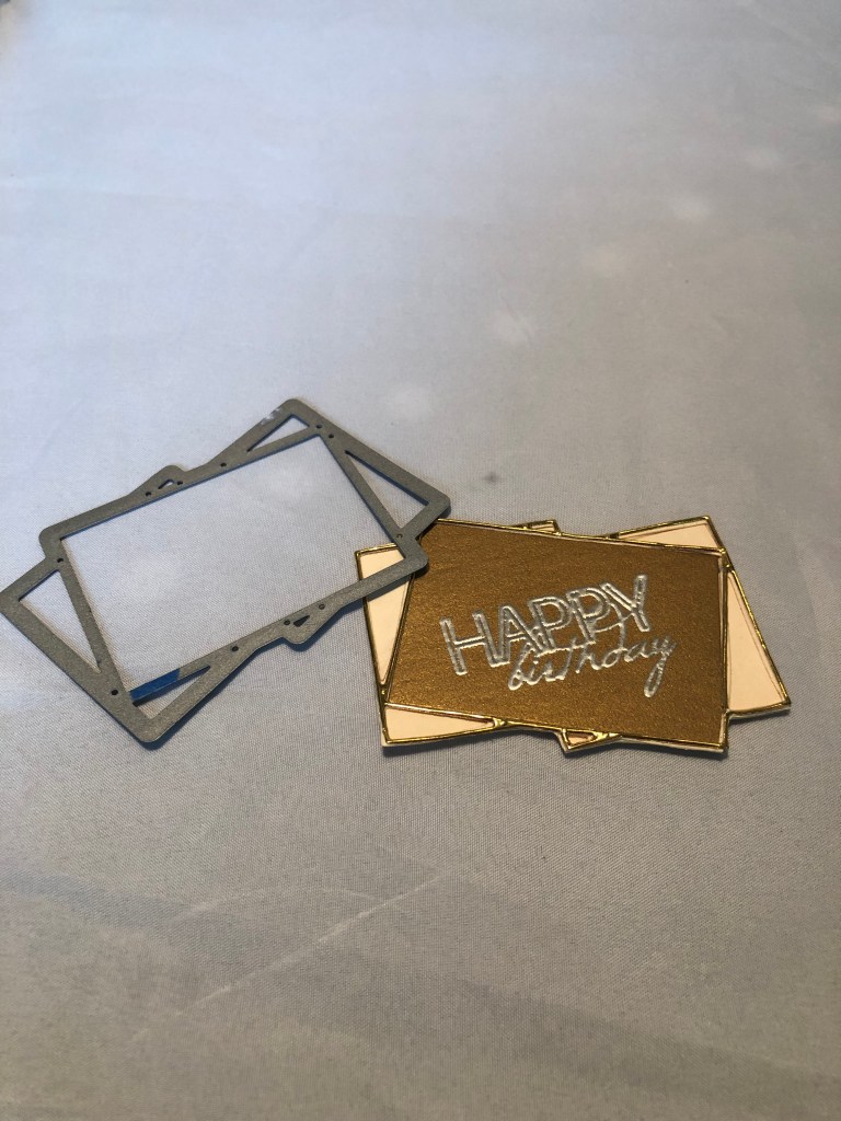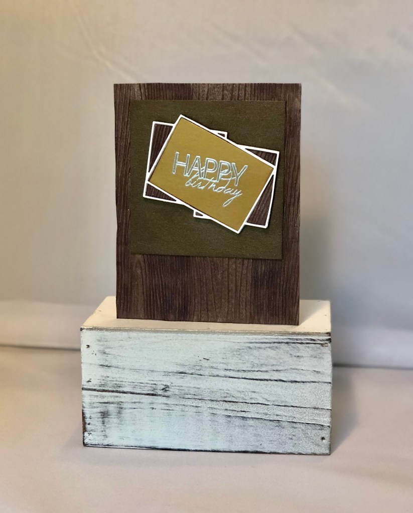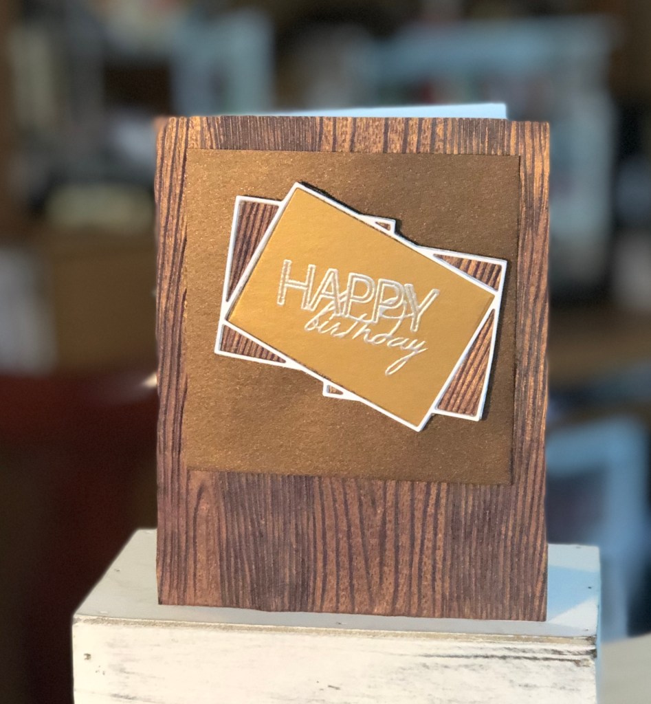 After that, I used my dies and die cutter and cut out several colors! The outer layer of the die made a very thin frame. I saved all the pieces. What was really fun, is they can go back in the frame several ways. The photo on the top right is a example. When I made the final birthday card, I decide to use the wood background that matched the base of the card.