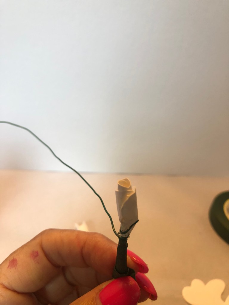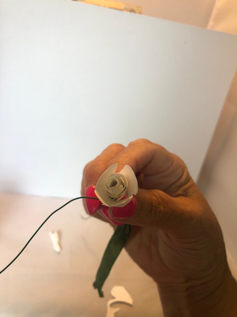 I begin by rolling the paper. On the first roll, I use rubber bond to make sure it stays tight; then, I wrap wire around the bottom of flower.
