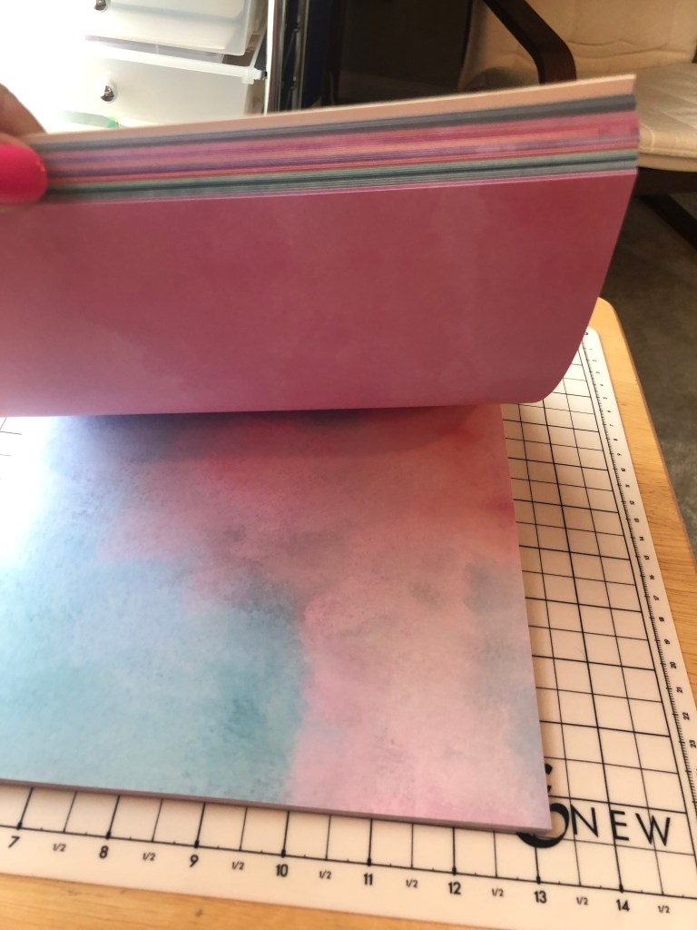 I purchased a fun paper pad at the local craft store that looks like it has been water colored. In Therese’s class, she suggested to try printed paper.