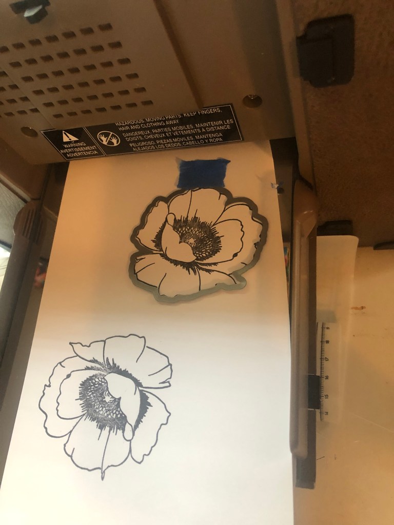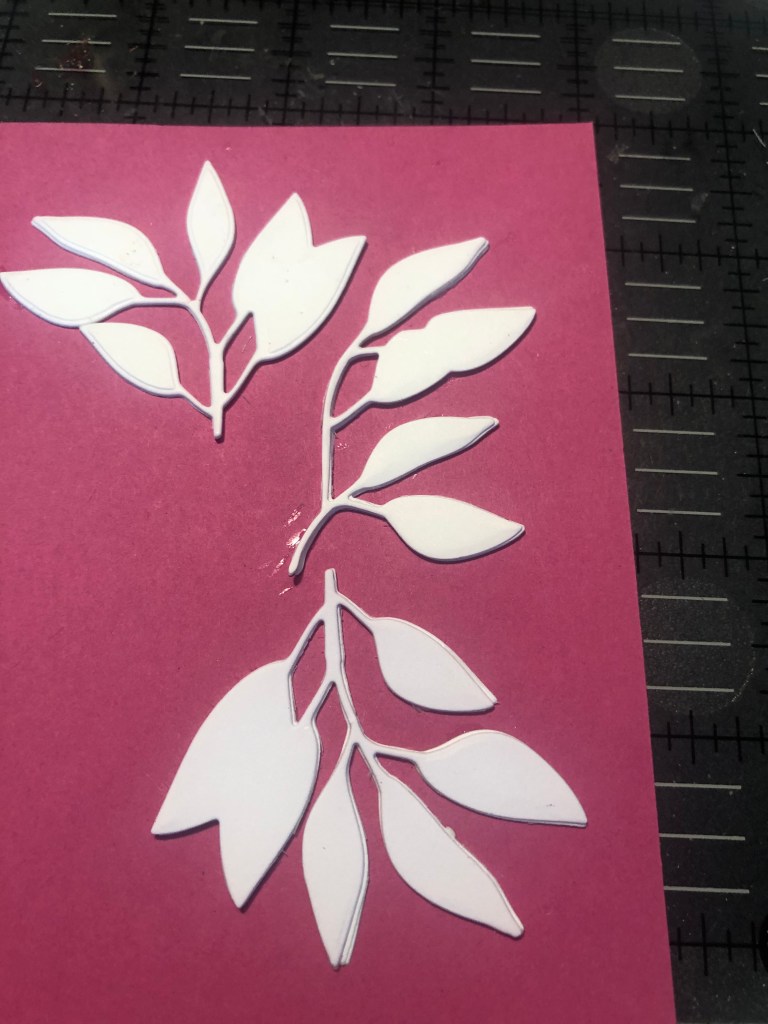 I am using the leave die set from the Wallpaper Art set. I cut out leaves and stacked them in sets of four. Then I glued them and let them dry. Next, I added a piece of paper on top and ran them through my die machine to get a nice impression.