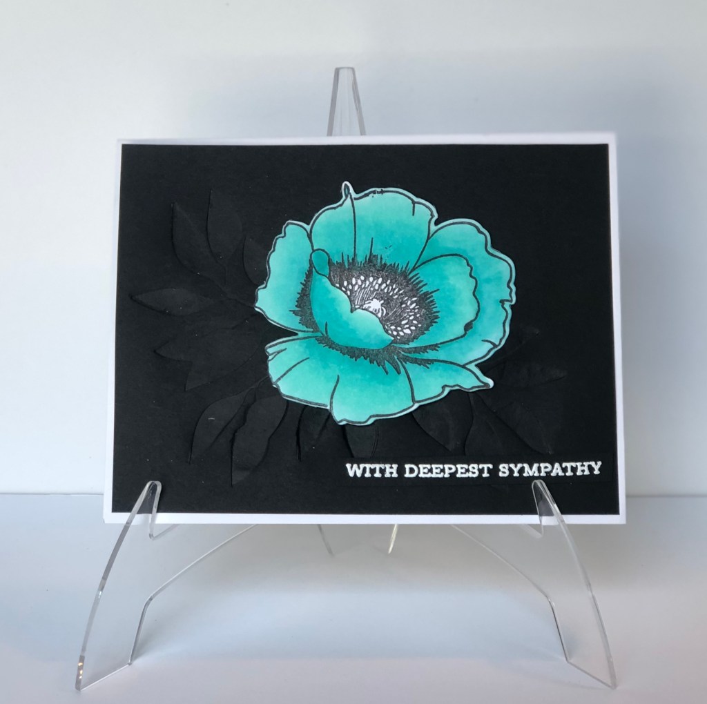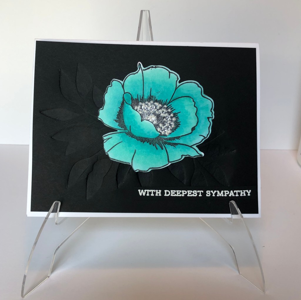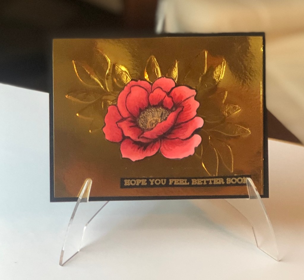 You can really see the impression on the leaves in this gold card. I really like how it turned out. Next, I colored the flower with Altenew markers. The sentiment is from Altenew’s Sentiment Strips stamp set.