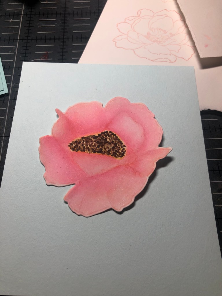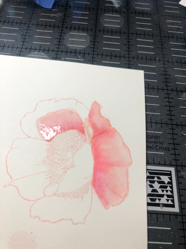 One of techniques I am practicing is no line watercoloring. To start my project, I stamp the image with distressed ink in pink. The stamp I used is Altenew Beautiful Peony- I will attach the link at bottom of blog.