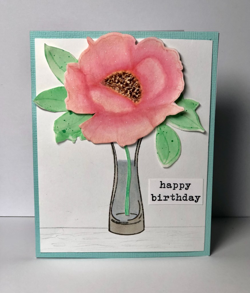 I finished my card by adding a bit of wink of Stella, that means I used a bit of liquid glitter. Next, I used a Altenew Versatile Vase stamp set to stamp the vase on white card stock and I hand drew the table line. I added a greeting using Altenew’s Birthday greeting. Now I have a birthday card for my friends birthday tomorrow.