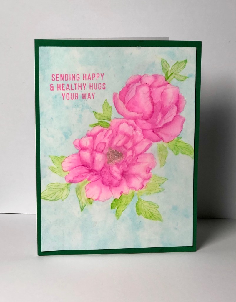 To finish the card, I added blue watercolor to a plastic sheet and smooshed the paper on it till I liked the result. Then, I added a greeting. I love how this card turned out!